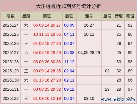 开奖回来:体彩大乐透第2025132期奖号为:01、09、10、12、19 + 06、07。 上期奖号中开出1组连号09,10,无重号,跨度为18,和值为51。 体彩大乐透近10期奖号数据统计表 连...